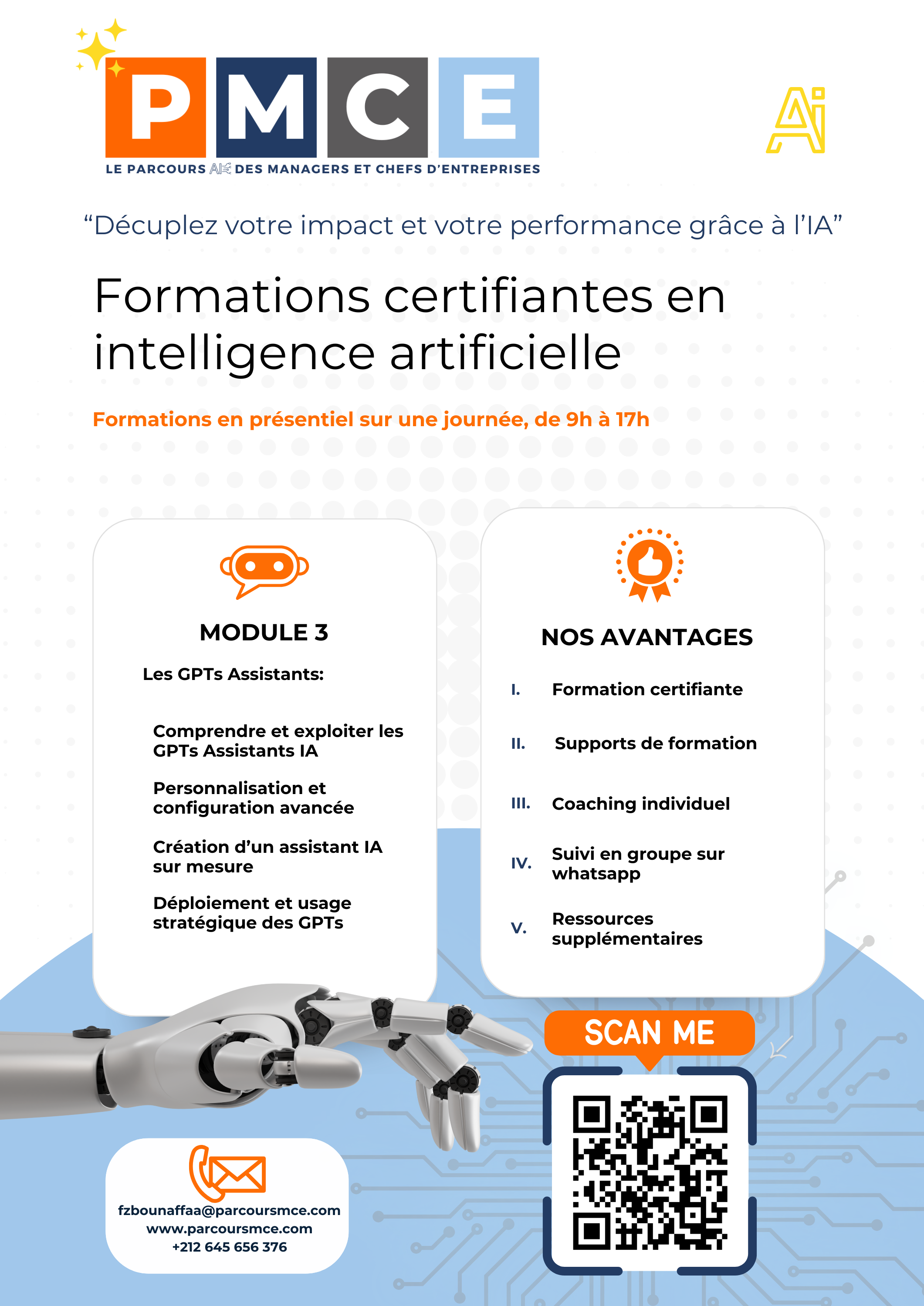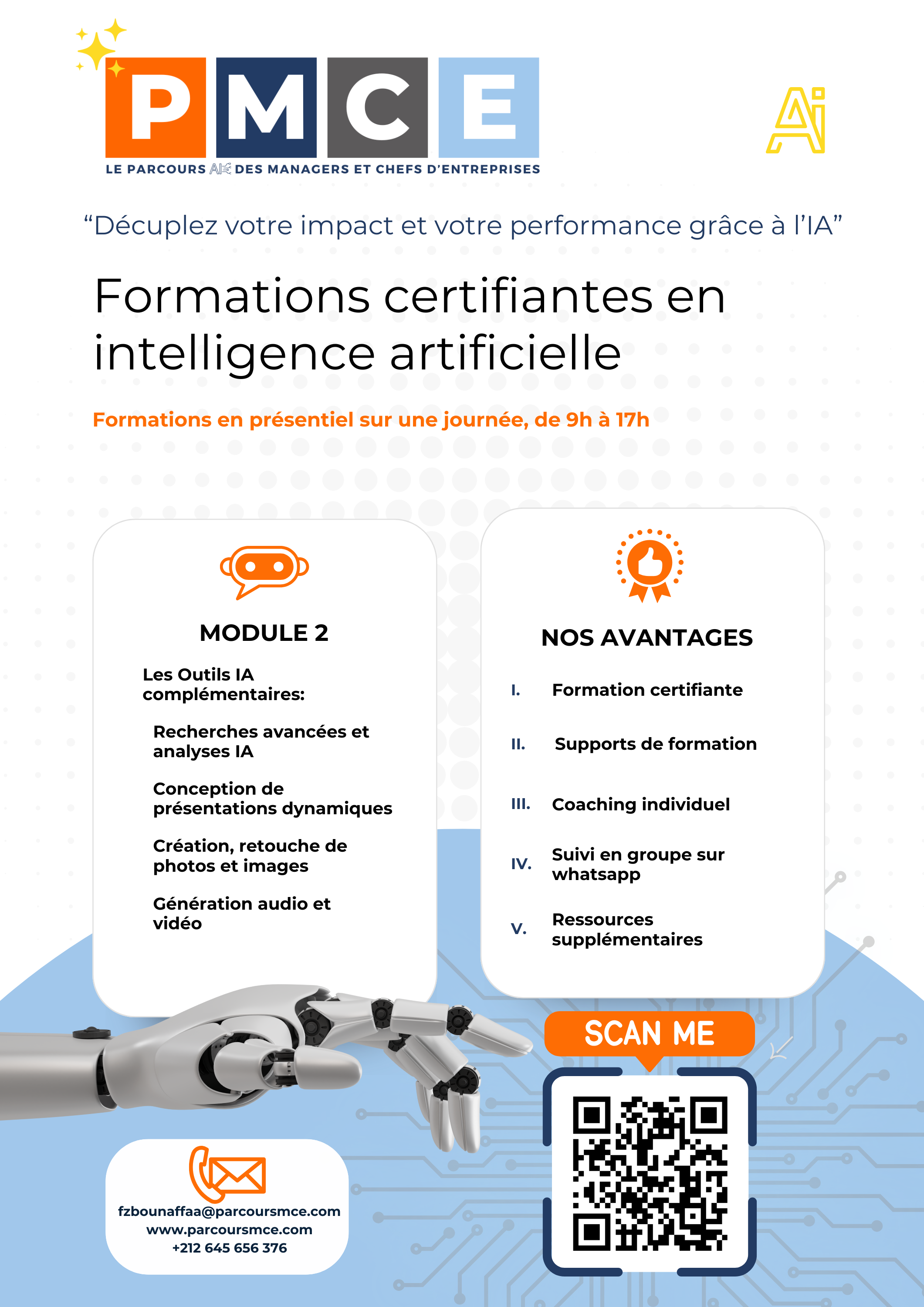Parcours MCE propose des formations en intelligence artificielle et entrepreneuriat (en présentiel à Casablanca) ainsi que des services de coaching et de conseil en IA (audit IA, accompagnement stratégique, etc.).
