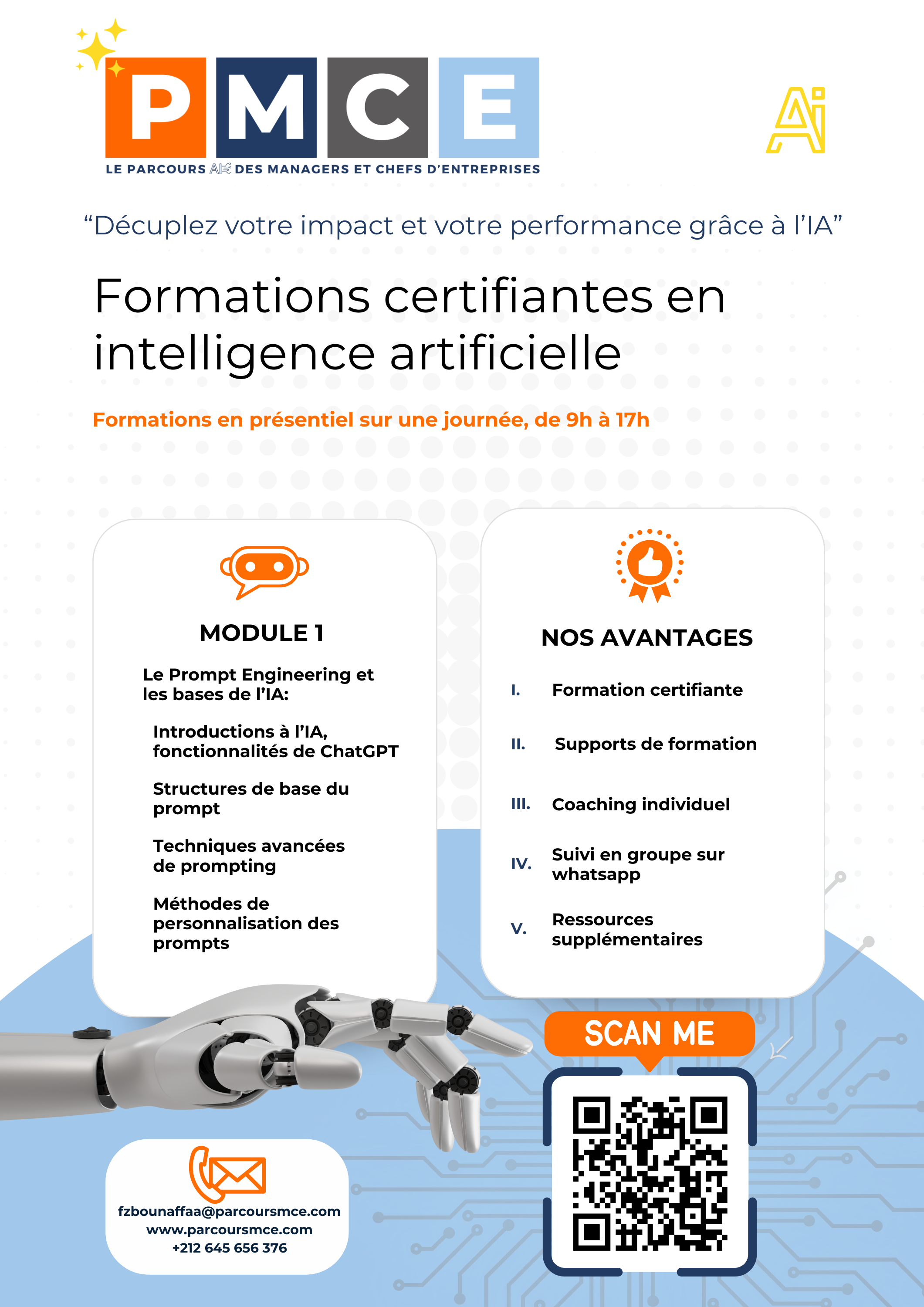 Parcours MCE propose des formations en intelligence artificielle et entrepreneuriat (en présentiel à Casablanca) ainsi que des services de coaching et de conseil en IA (audit IA, accompagnement stratégique, etc.).